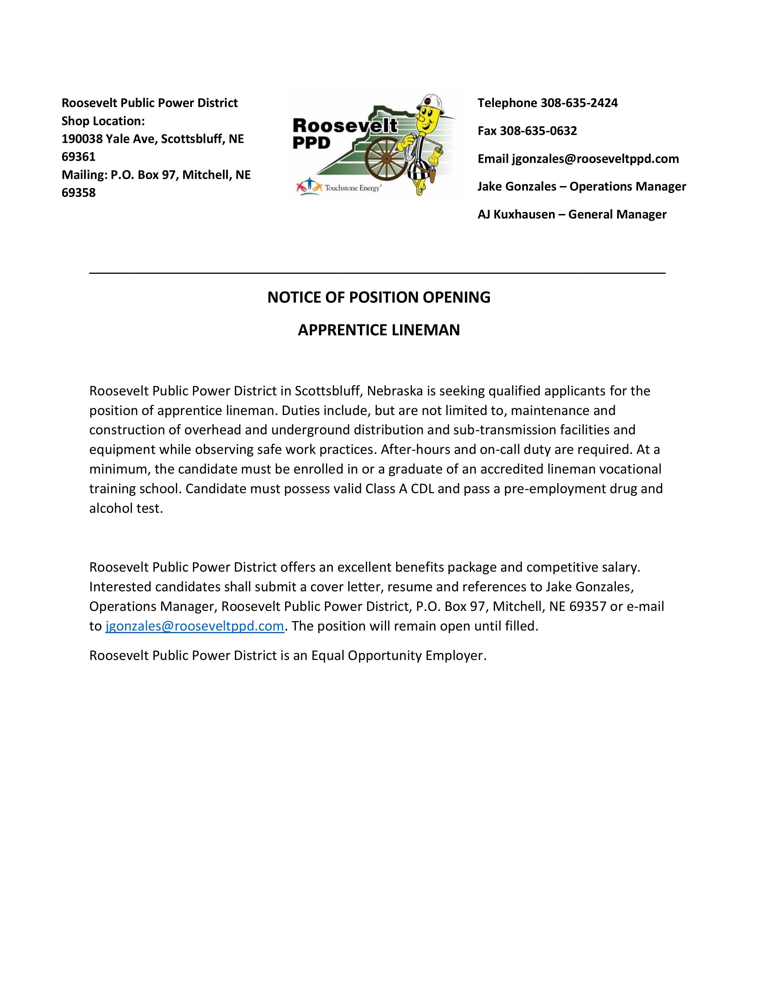 We are always looking for qualified people to help Roosevelt PPD's mission to help our customers. Though we are not currently hiring, please check back for updates on openings. Lineman opening.jpg